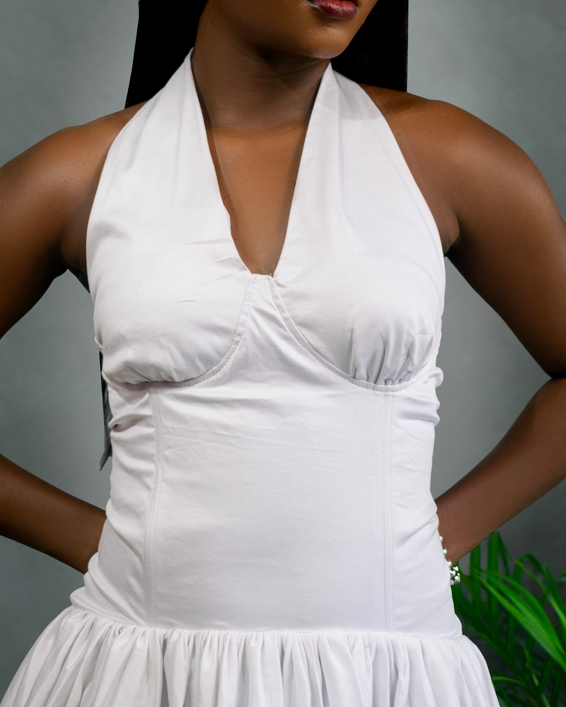 A crisp white halter dress with a fitted V-neck bodice. The cinched waist flows into a dramatic, voluminous floor-length skirt that adds structure and classic elegance.